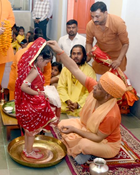 शुक्रवार को गोरक्षपीठाधीश्वर योगी आदित्यनाथ ने मंदिर स्थित अपने आवास परिसर के प्रथम तल पर परंपरागत रूप से पीतल के परात में जल से सभी नौ कुंवारी कन्याओं के बारी-बारी पांव धोये। उनके माथे पर रोली, चंदन, दही, अक्षत और शक्तिपीठ की वेदी पर उगाई गई जई का तिलक लगाया। माला पहनाकर, चुनरी ओढ़ाकर, उपहार एवं दक्षिणा प्रदान कर आशीर्वाद लिया। पूजन के बाद इन कन्याओं को मंदिर की रसोई में पकाया गया ताजा भोजन प्रसाद सीएम योगी ने अपने हाथों से परोसा। इन नौ कन्याओं के अतिरिक्त बड़ी संख्या में पहुंची बालिकाओं और बटुकों को भी पूजनोपरांत श्रद्धापूर्वक भोजन कराकर उपहार व दक्षिणा दिया गया।