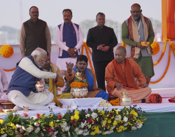 महाकुम्भ नगर। प्रयागराज महाकुम्भ के आयोजन से पूर्व प्रधानमंत्री नरेंद्र मोदी ने शुक्रवार को त्रिवेणी संगम में पूजा अर्चना कर 13 जनवरी से शुरू हो रहे महाकुम्भ के सफल आयोजन की कामना की। इस दौरान पीएम मोदी ने कुम्भ कलश का भी कुम्भाभिषेक किया। यह कुम्भ कलश रत्नजड़ित है और अष्टधातु का बना हुआ है।
