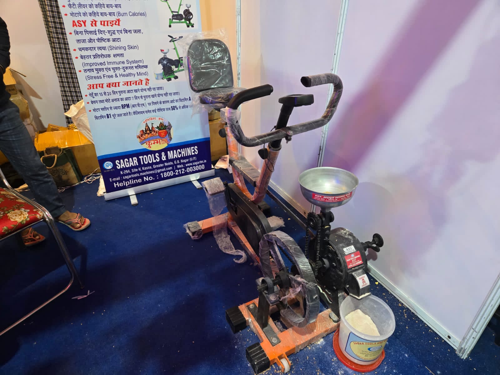 महाकुम्भनगर। महाकुम्भ 2025 में ओडीओपी प्रदर्शनी में गाजियाबाद की इंजीनियरिंग कंपनी का एक अनोखा उत्पाद लोगों का ध्यान खींच रहा है। पैरों से चलने वाली यह आटा चक्की, न केवल ताजा आटा तैयार करती है, बल्कि इसे इस्तेमाल करने वाला व्यक्ति व्यायाम कर फिट भी रह सकता है। श्रद्धालुओं के लिए यह मशीन मुफ्त में आटे की पिसाई कर रही है। मीडिया सेंटर के पास लगी इस प्रदर्शनी में लोग बड़ी संख्या में इस अनोखी चक्की को देखने और इस्तेमाल करने आ रहे हैं। मशीन केवल 20 मिनट में 1 किलो गेहूं, मक्का, ज्वार या बाजरा का महीन आटा तैयार कर देती है।