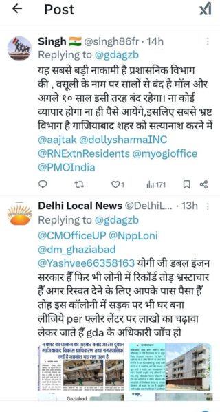 यही नहीं जीडीए ट्विटर पर एक और प्रतिक्रिया गौरतलब है। जिसमें कहा गया है ‘योगी जी डबल इंजन सरकार हैं फिर भी लोनी में रिकार्ड तोड़ भ्रष्टाचार है। अगर रिश्वत देने के लिए आपके पास पैसा है तो तो इस कालोनी में सड़क पर भी घर बना लीजिए। प्रति फ्लोर लैंटर पर लाखों का चढ़ावा ले कर जाते हैं जीडीए के अधिकारी। जांच हो’। इस प्रतिक्रिया के साथ ही मौके की सचित्र वास्तविक स्थिति भी दर्शाई गई है।