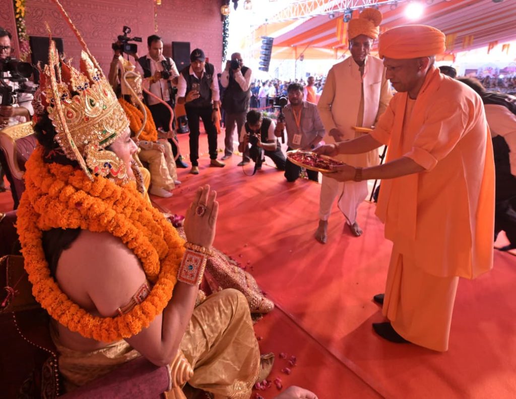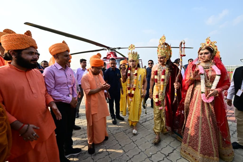 पुष्पवर्षा और वैदिक मंत्रोच्चारण के बीच जब मुख्यमंत्री ने गुरु वशिष्ठ के साथ, भगवान श्रीराम, माता सीता और लक्ष्मण, भरत, शत्रुघ्न व हनुमान का पूजन और वंदन किया तो साक्षात त्रेता युग का आभास हुआ। स्वर्ण सिंहासन, रथ, अश्व और सुसज्जित राजसभा ने त्रेता कालीन रामराज्य को सजीव कर दिया। सीएम योगी ने सबसे पहले राम, लक्ष्मण, मां सीता और हनुमान जी को माला पहनाई। आगे आगे राम, उनके पीछे माता सीता, लक्ष्मण और हनुमान रथ पर सवार हुए।