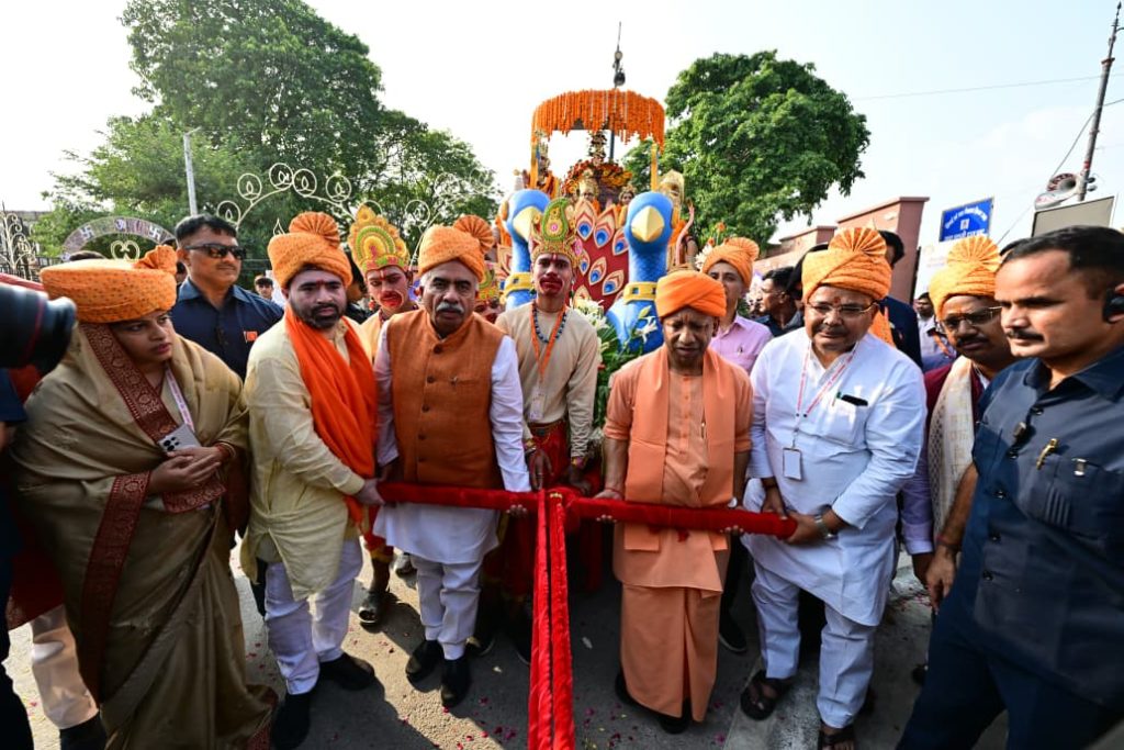 योगी ने संतों के साथ खींचा प्रभु राम का रथ, पुष्पवर्षा और वैदिक मंत्रोच्चार से गूंजा रामकथा पार्क