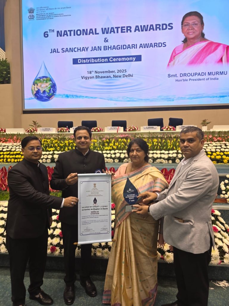गाजियाबाद। नगर निगम द्वारा नगर आयुक्त विक्रमादित्य सिंह मलिक के नेतृत्व में जल संचय को बढ़ावा दिया गया है जिसके तहत जलकल विभाग द्वारा 11406 जल संचयन हेतु स्ट्रक्चर बनाए गए हैं। जिसमें रेन वाटर हार्वेस्टिंग के साथ-साथ तालाबों का भी जीर्णोद्धार किया गया है। जल शक्ति मंत्रालय तथा मिनिस्ट्री आफ हाउसिंग अर्बन अफेयर ने नगर निगम को भारत में पांचवा तथा उत्तर प्रदेश में दूसरा स्थान दिया है। जिसके लिए जल शक्ति मंत्रालय द्वारा विज्ञान भवन दिल्ली में भव्य कार्यक्रम का आयोजन हुआ जिसमें राष्ट्रपति द्रौपदी मुर्मू की मौजूदगी में नगर निगम को पुरस्कृत किया गया, जल शक्ति मंत्रालय से केंद्रीय मंत्री सी आर पाटिल के द्वारा महापौर सुनीता दयाल तथा नगर आयुक्त विक्रमादित्य सिंह मलिक को प्रशस्ति पत्र भेंट किया गया। भारत के अनेकों प्रदेशों से आए हुए अतिथियों ने भी नगर निगम द्वारा किए जा रहे जल संचय जल भागीदारी के कार्यों की सहाना की गई। राष्ट्रपति द्वारा भी उपस्थित जनों का उत्साह वर्धन किया, गाजियाबाद नगर निगम को इसी क्रम में कार्य करने हेतु 2 करोड़ का पुरस्कार भी नगर निगम को मिला, कार्यक्रम में मौके पर महाप्रबंधक जल कामाख्या प्रसाद आनंद तथा अधिशासी अभियंता जल आस कुमार भी उपस्थित रहे।