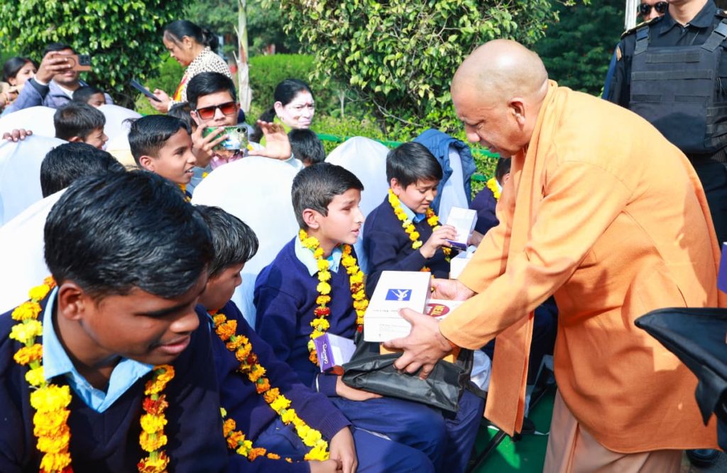 उत्तर प्रदेश में विश्व दिव्यांग दिवस 2025 के अंतर्गत आयोजित राज्य स्तरीय कार्यक्रम में मुख्यमंत्री योगी आदित्यनाथ ने दिव्यांग विद्यार्थियों से संवाद करते हुए उन्हें चॉकलेट, मील बॉक्स, एमआर किट तथा अन्य उपहार दिए। इस दौरान दिव्यांग विद्यार्थियों के अनुरोध पर मुख्यमंत्री ने उनके साथ सेल्फी भी खिंचवाई। इसके बाद विश्व दिव्यांग दिवस 2025 के उपलक्ष्य में आयोजित प्रदर्शनी में हिस्सा लेते हुए उन्होंने विभिन्न स्टॉल्स का निरीक्षण किया। उल्लेखनीय है कि बुधवार को लखनऊ के इंदिरा गांधी प्रतिष्ठान में आयोजित कार्यक्रम में दिव्यांगजन सशक्तिकरण, छात्रवृत्ति वितरण, सहायक उपकरण प्रदान करने तथा उत्कृष्ट कार्य करने वाले व्यक्तियों और संस्थाओं के सम्मान से जुड़े इस राज्य स्तरीय कार्यक्रम में लघु फिल्म का भी प्रदर्शन किया गया। कार्यक्रम में पिछड़ा वर्ग कल्याण तथा दिव्यांगजन सशक्तिकरण विभाग के राज्य मंत्री स्वतंत्र प्रभार नरेंद्र कश्यप, लखनऊ की महापौर सुषमा खर्कवाल, उत्तर प्रदेश सरकार के पूर्व मंत्री और विधान परिषद सदस्य डॉ. महेंद्र सिंह, विधान परिषद सदस्य मुकेश शर्मा, रामचंद्र प्रधान, इंजीनियर अवनीश कुमार सिंह, विधायक डॉ. नीरज बोरा, जयदेवी सहित विभाग के प्रमुख सचिव और अन्य अधिकारी तथा लाभार्थी उपस्थित रहे।