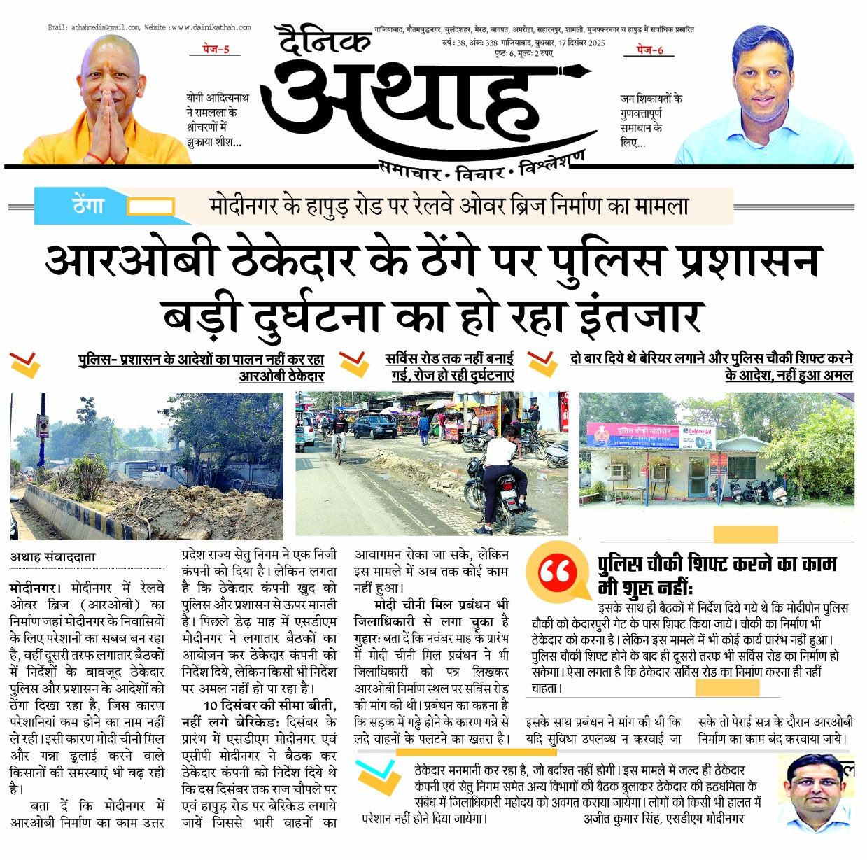 बता दें कि दैनिक अथाह ने 17 दिसंबर के अंक में ‘आरओबी ठेकेदार के ठेंगे पर पुलिस- प्रशासन, बड़ी दुर्घटना का हो रहा इंतजार’ शीर्षक से प्रमुखता से खबर प्रकाशित की थी। खबर प्रकाशित होने के बाद एसडीएम मोदीनगर अजीत कुमार सिंह ने बुधवार को ही पुलिस, सेतु निगम, ठेकेदार कंपनी, नगर पालिका एवं बिजली विभाग के अधिकारियों की बैठक बुलाई। बैठक में एसडीएम ने लोगों को हो रही परेशानी को लेकर नाराजगी जताई।