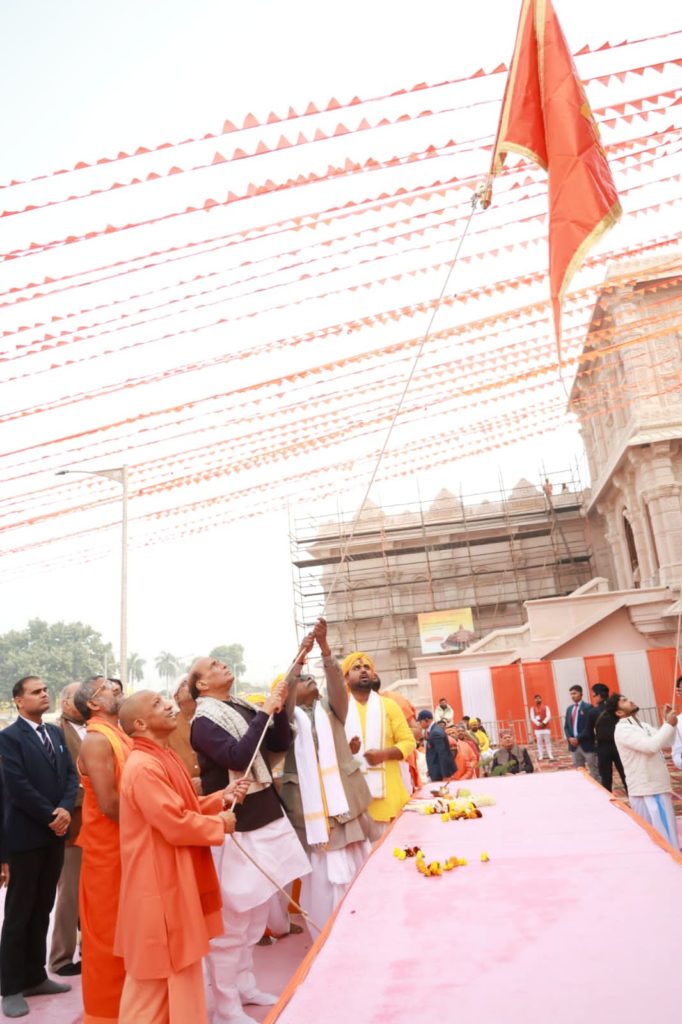 रक्षा मंत्री व मुख्यमंत्री ने श्रीराम की जयघोष व मंत्रोच्चार के बीच विधिवत पूजन कर मां अन्नपूर्णा मंदिर के शिखर पर धर्मध्वजा का आरोहण किया।