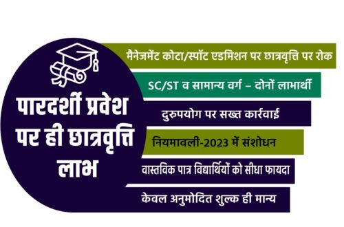 संशोधित नियमों के अनुसार निजी शिक्षण संस्थानों में व्यावसायिक अथवा तकनीकी पाठ्यक्रमों में अध्ययनरत अनुसूचित जाति एवं अनुसूचित जनजाति के छात्रों को योजना का लाभ तभी मिलेगा, जब उनका प्रवेश पूरी तरह पारदर्शी प्रक्रिया से हुआ हो। इसके तहत संस्थान द्वारा सार्वजनिक विज्ञापन जारी कर आवेदन आमंत्रित करना, रैंक सूची तैयार करना, चयन सूची प्रकाशित करना अनिवार्य होगा। साथ ही छात्रों से केवल सक्षम प्राधिकारी अथवा शुल्क नियामक समिति द्वारा अनुमोदित शुल्क ही लिया जाएगा।
