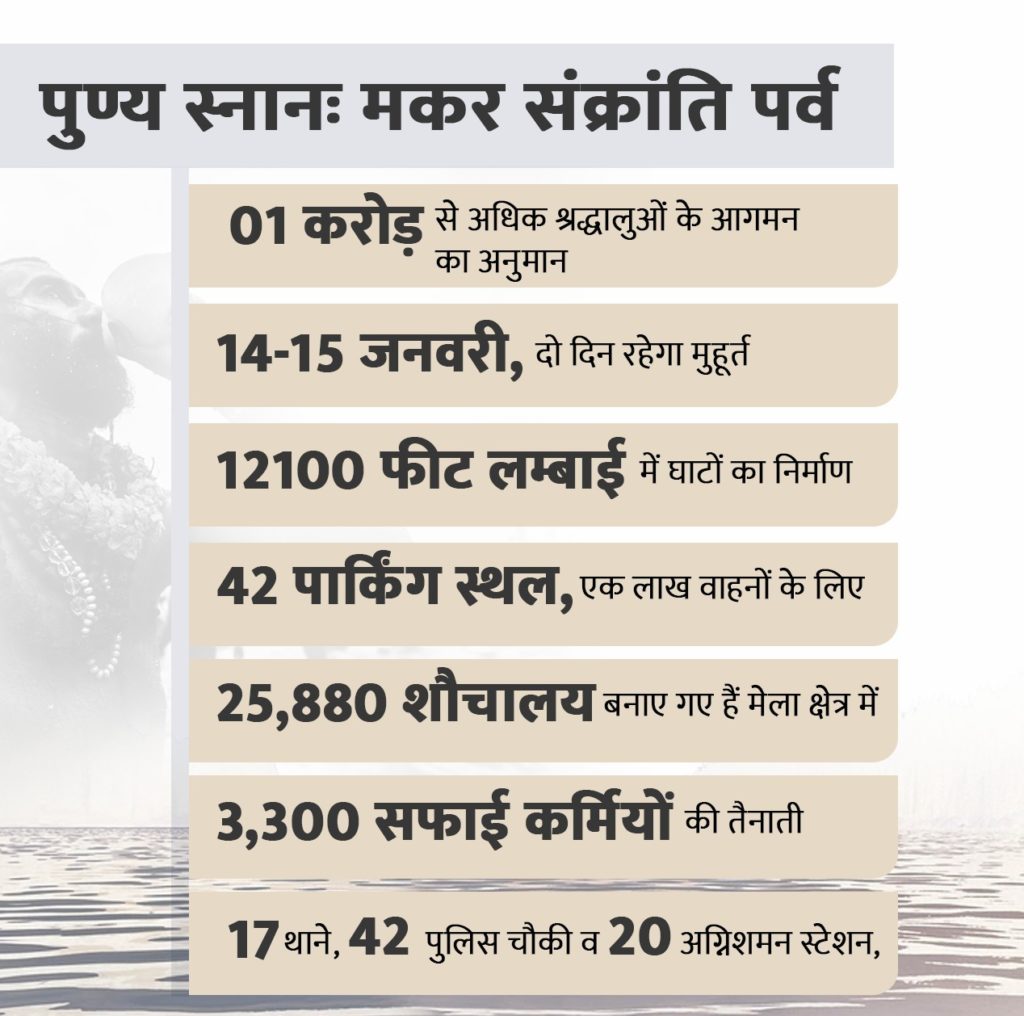 प्रयागराज। प्रयागराज के संगम तट पर आयोजित माघ मेले का दूसरा स्नान पर्व मकर संक्राति 15 जनवरी को है। पौष पूर्णिमा स्नान पर्व में 31 लाख से अधिक श्रद्धालुओं को सकुशल स्नान संपन्न कराने के बाद अब मेला प्रशासन ने मकर संक्रांति स्नान पर्व के लिए कमर कस ली है। इसके लिए स्नान घाटों पर विशेष व्यवस्था की गई है। श्रद्धालुओं को कम से कम पैदल चलना पड़े, इसके लिए घाटों के समीप ही पार्किंग की व्यवस्था की गई है। इस दौरान एक करोड़ से अधिक श्रद्धालुओं के स्नान का प्रशासन का अनुमान है।