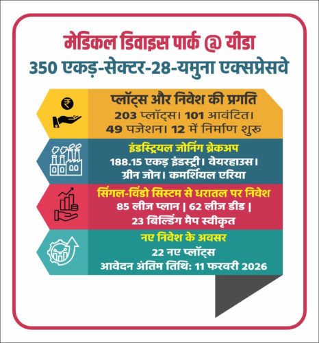 उल्लेखनीय है कि यमुना एक्सप्रेसवे औद्योगिक विकास प्राधिकरण में विकसित हो रहा मेडिकल डिवाइस पार्क, योगी सरकार के उस विजन का प्रतीक है, जिसमें उत्तर प्रदेश को नीति, इन्फ्रास्ट्रक्चर व भरोसा, तीनों स्तरों पर निवेशकों का पसंदीदा राज्य बनाया जा रहा है। यह पार्क आने वाले वर्षों में यूपी को मेडिकल डिवाइस मैन्युफैक्चरिंग का नया पावरहाउस बना सकता है।
