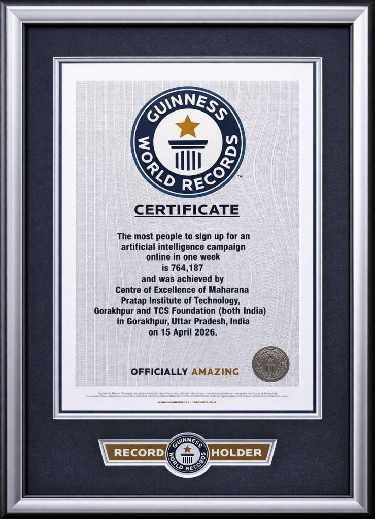यह प्रमाण पत्र एमपीआईटी में पूर्वी उत्तर प्रदेश के पहले सेंटर आॅफ एक्सीलेंस के लोकार्पण समारोह के मंच पर सौंपा गया। एमपीआईटी ने ‘एआई फॉर आॅल’ अवेयरनेस प्रोग्राम के लिए 5 लाख पंजीकरण का लक्ष्य रखा था। इसके लिए निर्धारित तिथि, 9 अप्रैल तक 764187 पंजीकरण हुए। इसके अंतर्गत दीनदयाल उपाध्याय गोरखपुर विश्वविद्यालय, मदन मोहन मालवीय प्रौद्योगिकी विश्वविद्यालय, महायोगी गोरखनाथ विश्वविद्यालय गोरखपुर, महायोगी गुरु गोरखनाथ राज्य आयुष विश्वविद्यालय, एमपी पॉलिटेक्निक, आईटीएम गीडा, बीआईटी गीडा आदि को भी साझा पहल में शामिल किया गया। गिनीज बुक आॅफ वर्ल्ड रिकॉर्ड्स के प्रतिनिधि ने बताया कि आॅनलाइन पंजीकरण की प्रक्रिया को कड़े मानकों पर परखने के बाद प्रमाण पत्र सौंपा गया है।