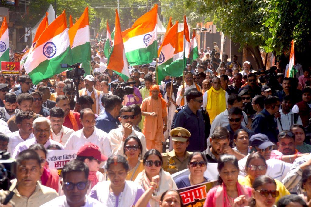 करीब 9.40 बजे मंच पर मुख्यमंत्री योगी आदित्यनाथ के पहुंचते ही वहां मौजूद महिलाओं ने केंद्र व प्रदेश सरकार के पक्ष में नारे लगाने शुरू कर दिए। महिलाओं ने सीएम योगी के सामने ही सपा-कांग्रेस का यूपी में भविष्य खत्म करने का वादा किया। उन्होंने अपने नारों के जरिए कहा कि आधी आबादी के आरक्षण का विरोध विपक्ष की राजनीति को खत्म कर देगा। सीएम योगी आदित्यनाथ की अगुवाई में लगभग 10 बजे हजारों महिलाओं ने मुख्यमंत्री आवास से जन आक्रोश पदयात्रा शुरू की। तपती धूप में सड़क पर पैदल चल रहे मुख्यमंत्री, उनके मंत्रियों और हजारों महिलाओं को देखकर सारा शहर थम गया। इस दौरान सिविल अस्पताल के सामने से विधानसभा की तरफ जा रहीं महिलाओं के नारों से पूरा क्षेत्र गूंज उठा। मुख्यमंत्री योगी आदित्यनाथ ने हाथ लहराकर पदयात्रा में शामिल सभी महिलाओं का अभिवादन किया।